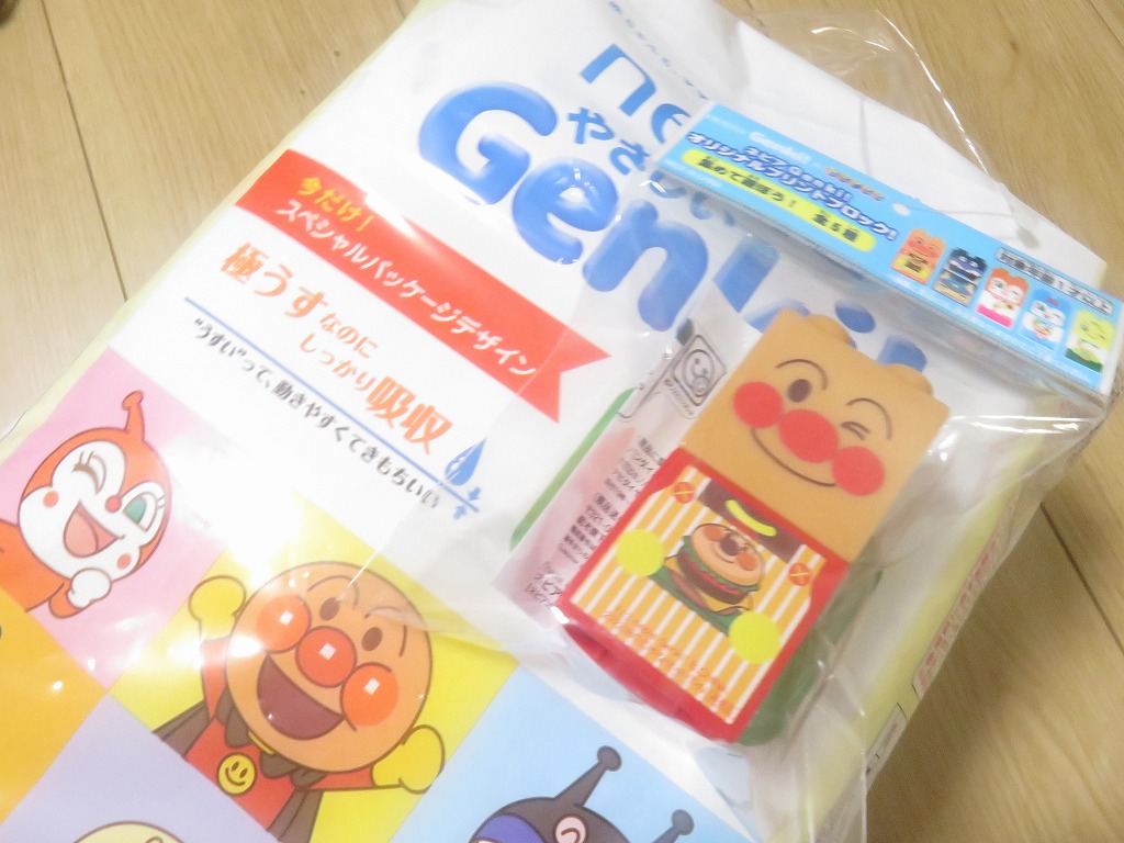 おむつのサイズがMだったら大きいサイズのLも買えるけど、もう息子のサイズがBIGなのでMについていたバイキンマンを泣く泣く諦めました。
