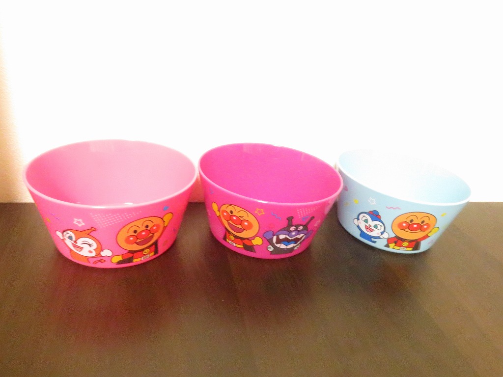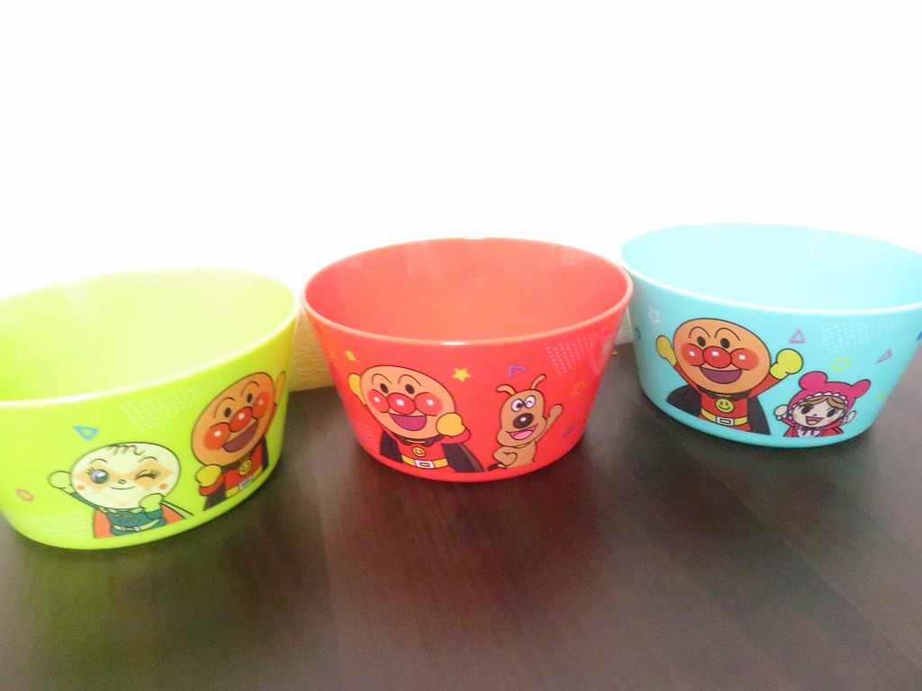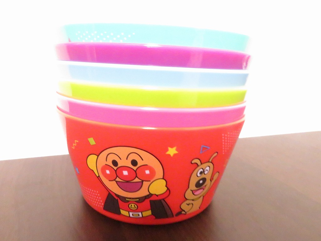 赤はチーズ。紫はばいきんまん。水色はコキンちゃん。ピンクはドキンちゃん。黄緑はメロンパンナちゃん。ミントは赤ちゃんまん。